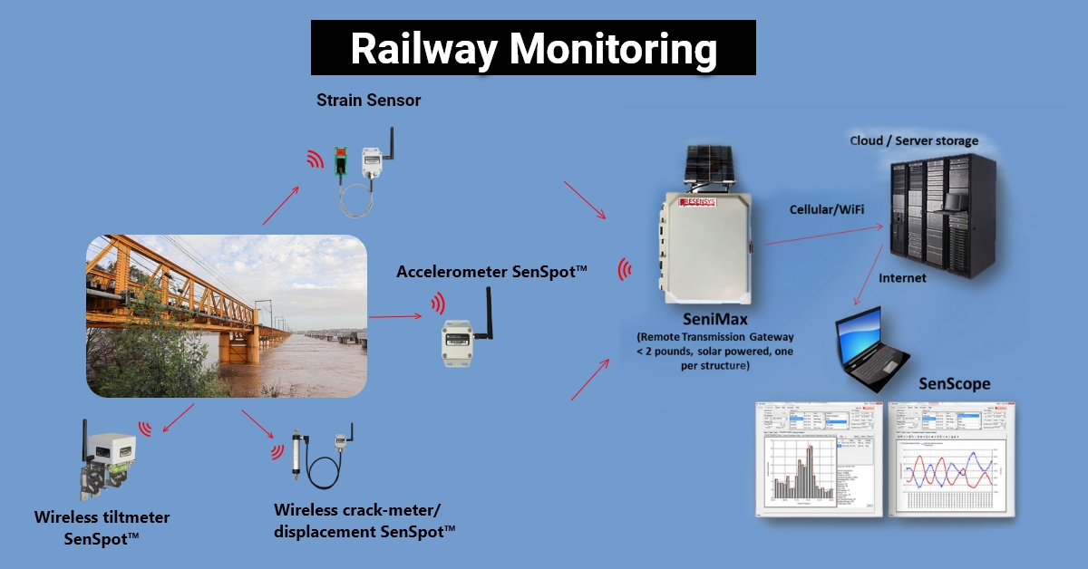 · Vibration Monitoring with SenSpotTM Accelerometer: This wireless railway track monitoring system can be mounted on trains. They can capture vibrations and track irregularities, such as bridge load bearing elements, piers, loose fastenings, rail wear, etc.